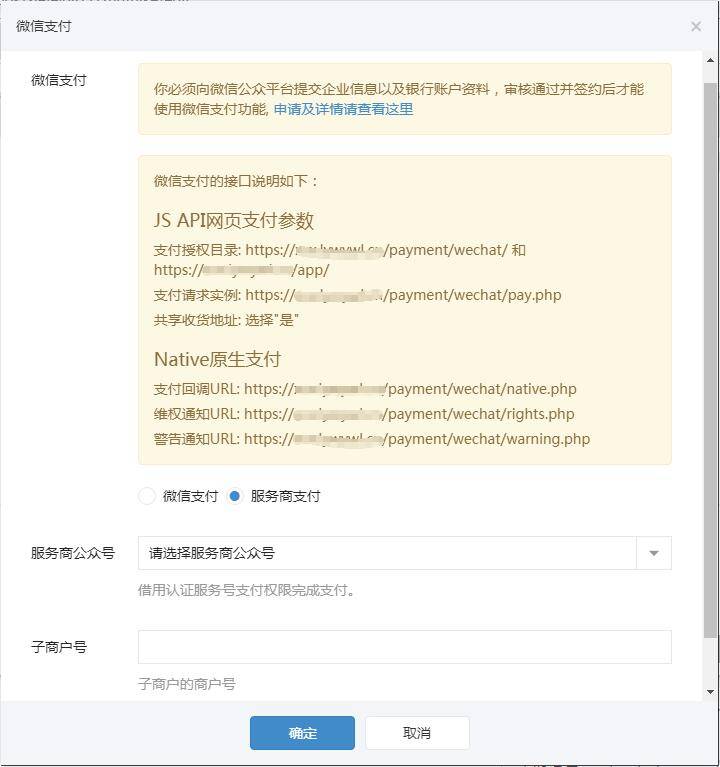 1、微信服务商子商户的公众号,设置微信支付方式为服务商支付,然后选择设置的服务商公众号,最后设置填写子商户号。