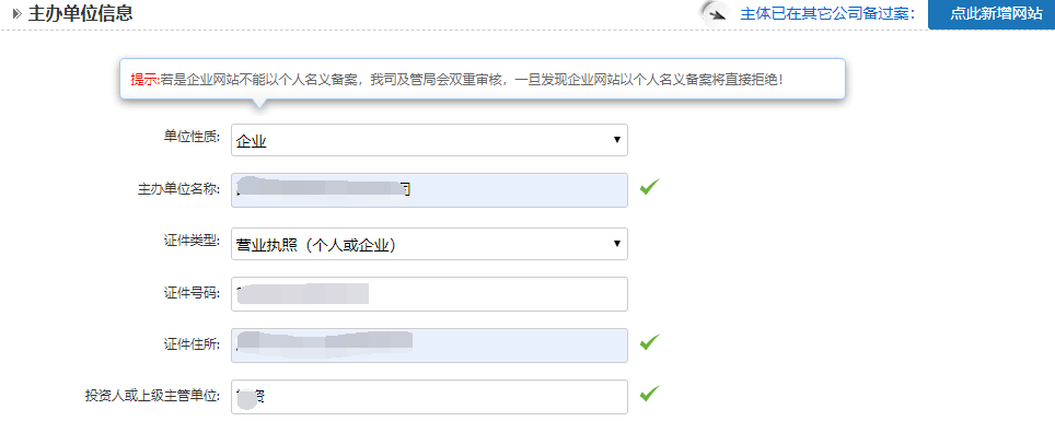 a.       系统将根据您填写的域名和证件,单位性质选择企业,系统将自动验证您的备案类型: